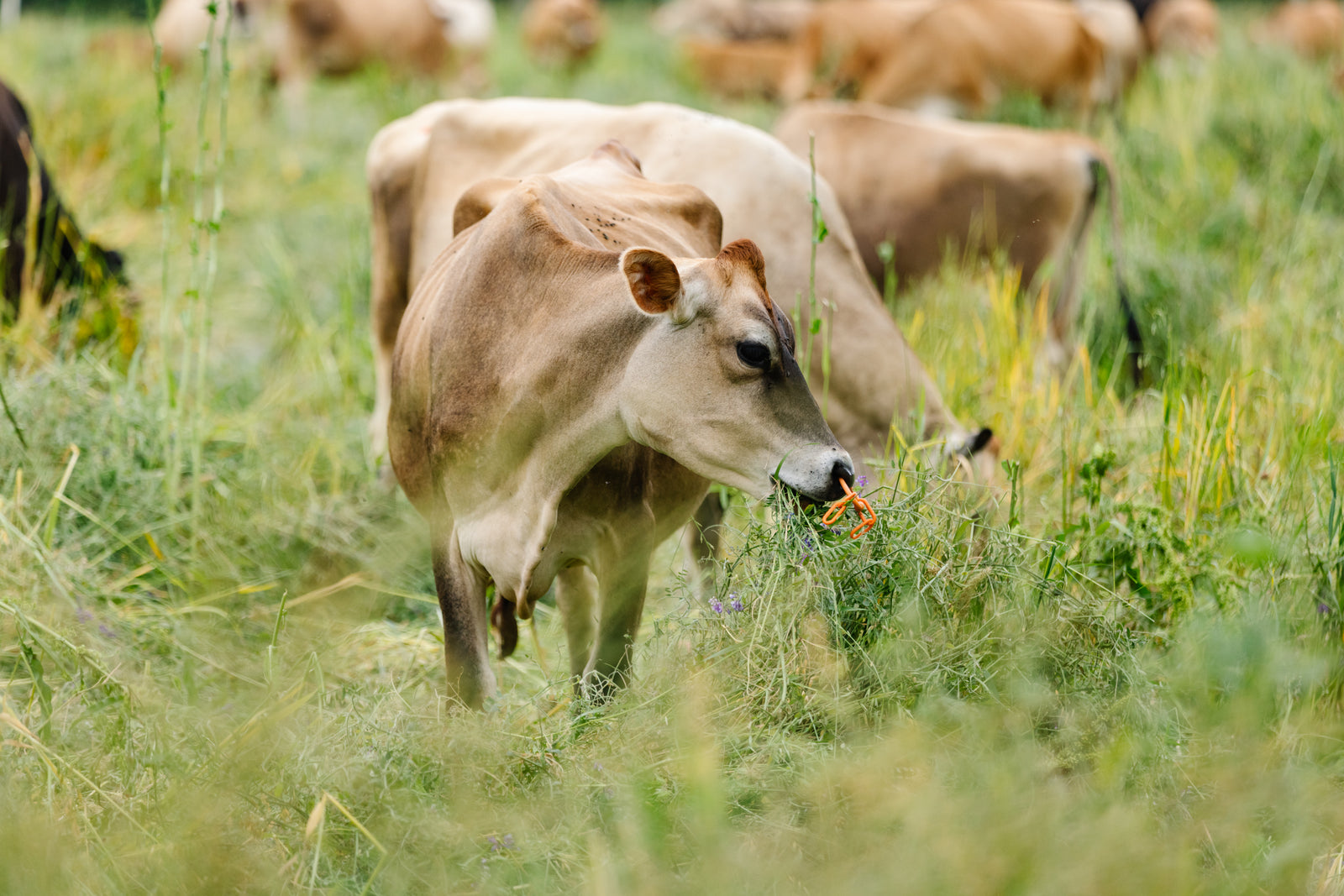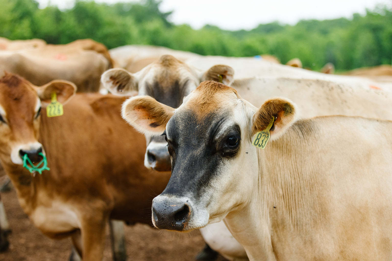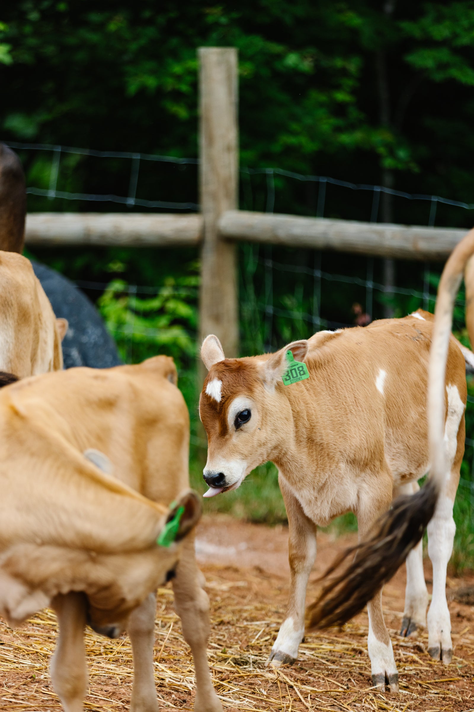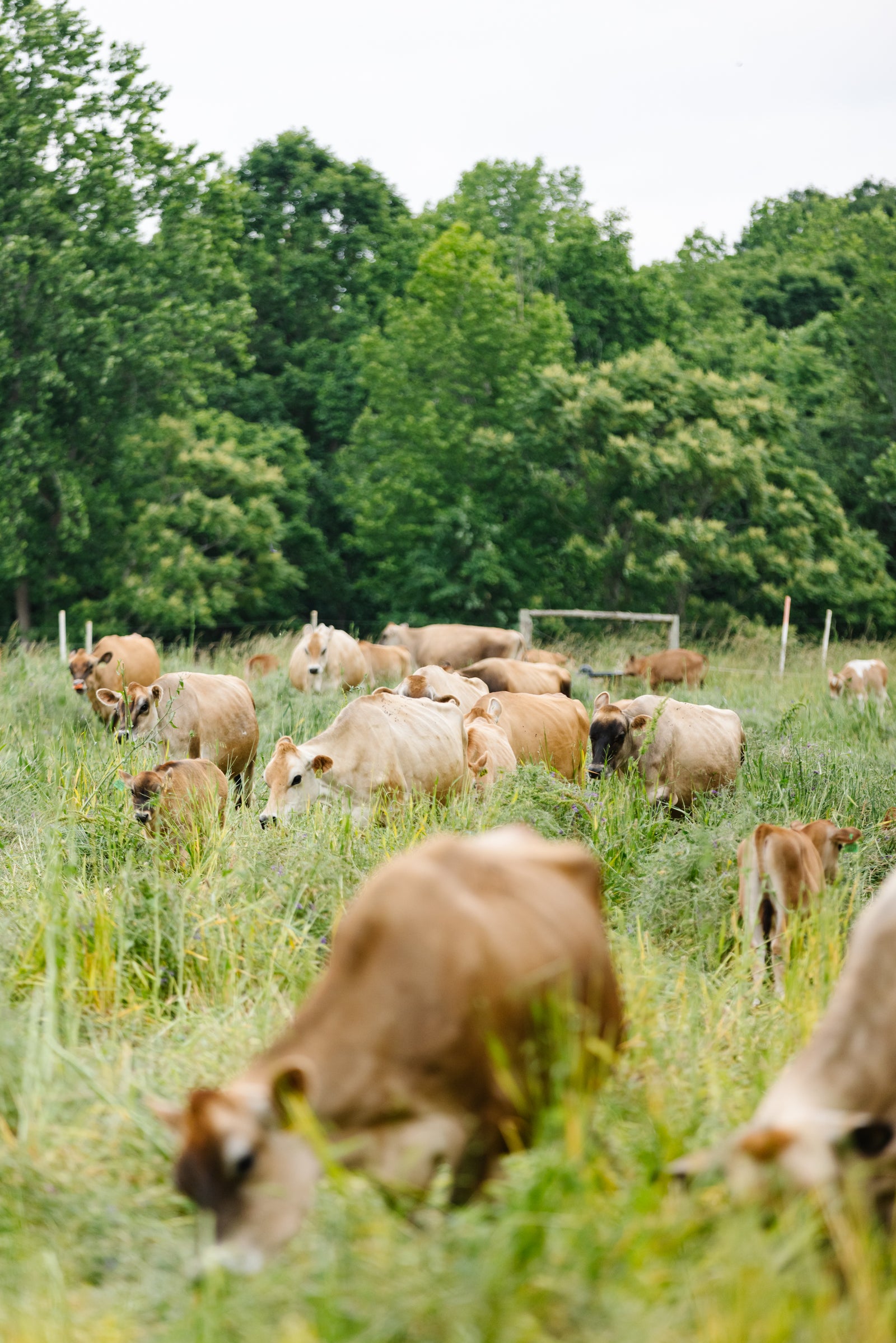 Our foundation cows came from two other breeding programs we respect, and they have been hand-selecting Jerseys to perform on pasture, milk with high components and perform their jobs beautifully well into their teens for several decades. Suzanne has added her own criteria, including the cow’s ability to letdown her milk even though she knows she is about to see her calf, and we are the only farm to our awareness that specifically breeds for this trait — which is really another old-fashioned trait, as it used to be commonplace for cows to be milked alongside their young. Our cows are also selected to be well-mannered around their young and comfort themselves with the sweetness that has endeared Jersey cows to people the world over.